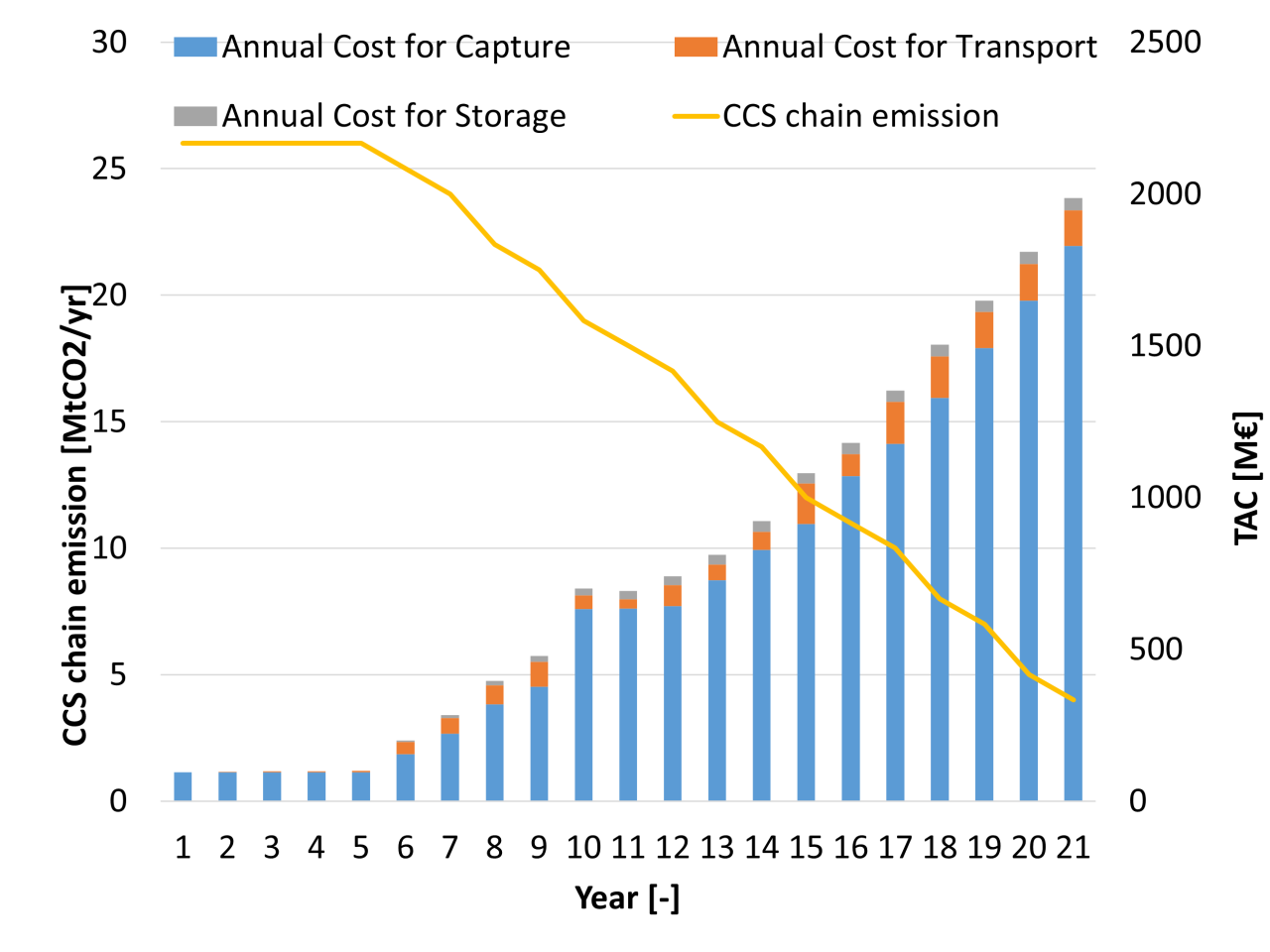 Il modello ha individuato strategie ottimali per l’installazione progressiva delle infrastrutture, privilegiando inizialmente i cementifici (più economici), seguiti da WtE, acciaierie e raffinerie. L’Annualized Cost of Stored Carbon (ACSC) minimo, pari a 29,2 €/tCO₂, si registra al 18° anno. L’applicazione ha dimostrato la fattibilità di un’infrastruttura CCS scalabile e sostenibile, utile per il raggiungimento degli obiettivi climatici nazionali.